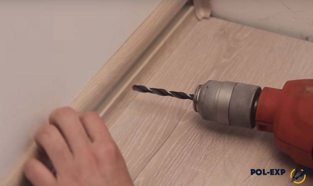 - На профиле плинтуса через каждые 50 см просверливают отверстия 2-3 мм в диаметре. В отверстие делается коническое углубление.