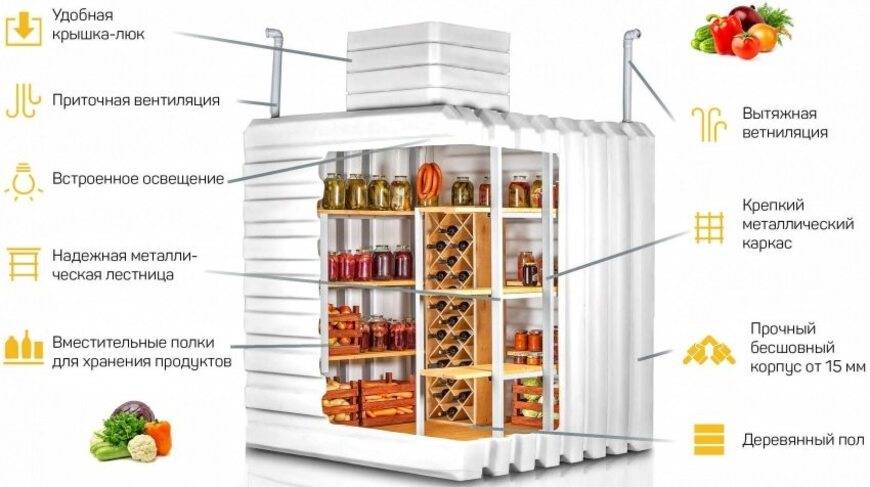 Самое главное требование — безопасность материала. Погреб для хранения овощей или фруктов обязан быть изготовлен из пищевого пластика. В противном случае там позволено держать только консервацию в банках.