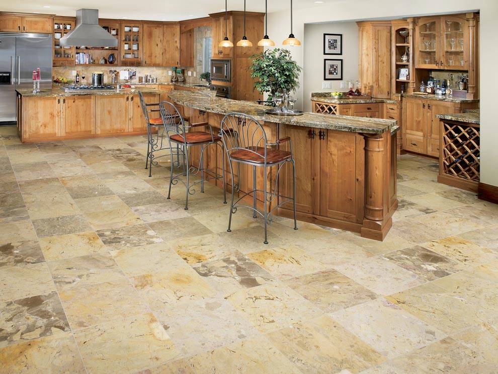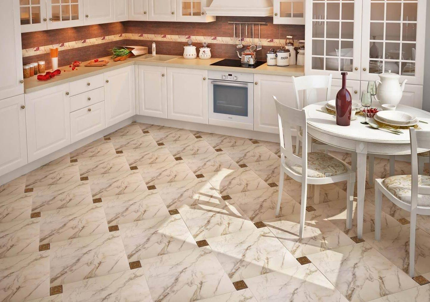 При покупке плитки на пол для кухни, как на фото, выбирают один из следующих вариантов: