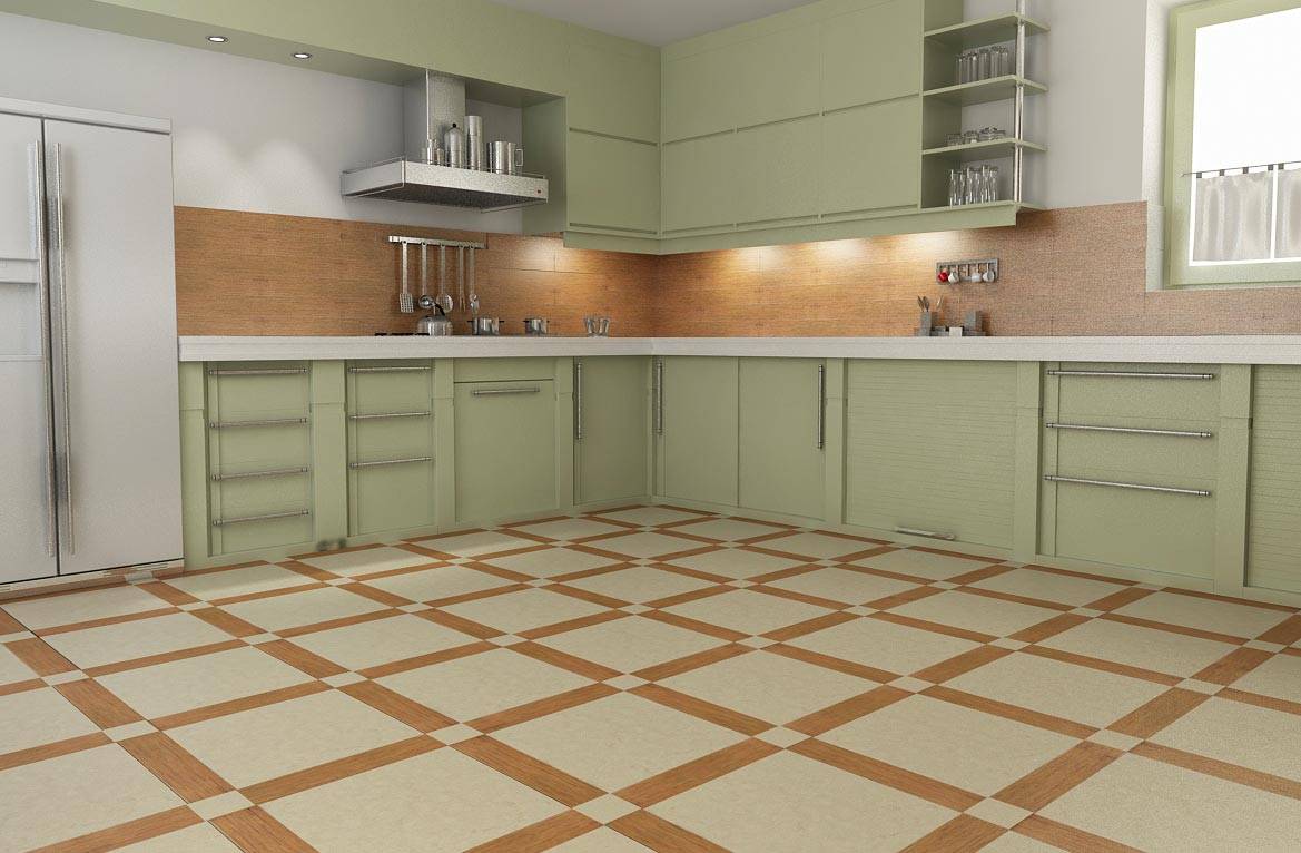 - Керамическая плитка (кафель) — наиболее популярный напольный материал для кухни. Она экологически чистая, изготавливается путём обжига смеси из глины, песка и минеральных веществ. Кафель — износоустойчивый, водонепроницаемый материал. На рынке можно найти кафель различных расцветок и текстур. Минусы этого материала: выгорание рисунка, истирание верхнего слоя. При транспортировке кафель можно легко повредить. Керамическое покрытие бывает матовым, глянцевым и с напылением.