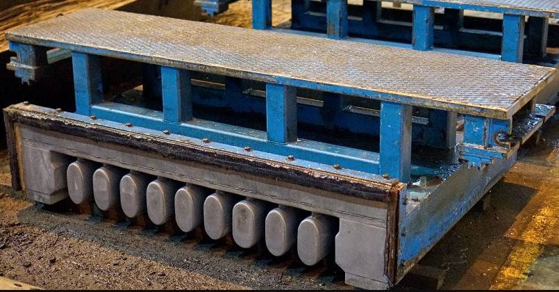 В опалубку устанавливается арматура и кессоны (круглые полые емкости). Бетон укладывается в металлическую опалубку фиксированной длины и ширины (например, 6,0 х 1,2 х 0,22) ![]() | Натягивается арматура. Формующая машина уплотняет, придает форму и укладывает бетон определенной ширины (например, 1,2м) и большой длины (не менее 10 метров). После твердения нарезается на нужную длину ![]() |