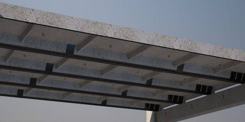 Между балками проводят укладку сборных пустотелых плит из железобетона. Их толщина составляет 9 см. на плиты наносят слой шлака и железобетонной стяжки толщиной от 8 до 10 см. Расход стали достаточно высокий и составляет от 25 до 30 килограмм на метр квадратный. Все зависит от марки стали, из которой изготовлены балки.