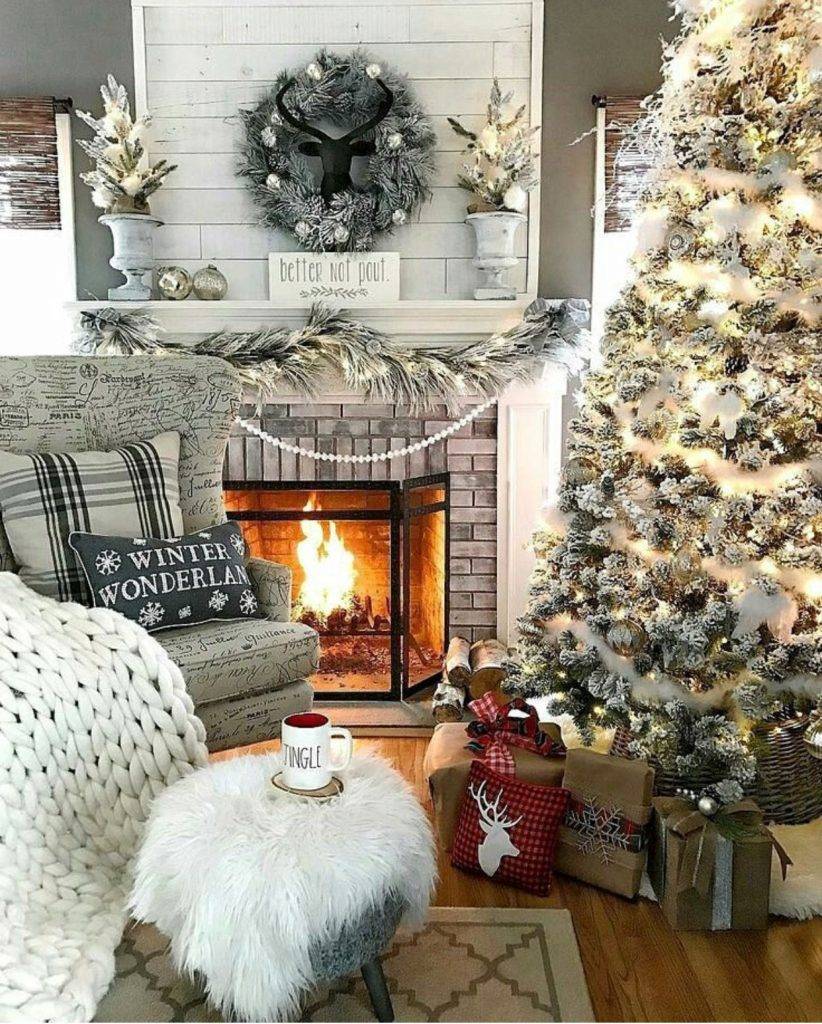 Рождественская композиция будет смотреться органично в общем дизайне гостиной, если оттенки, используемые для отделки камина, будут перекликаться с цветовой гаммой комнаты.