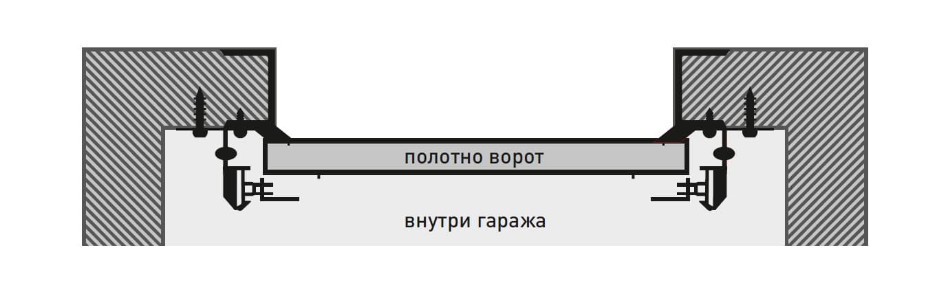 Бывает и так, что вверху или по бокам не хватает места для установки конструкции. Если слишком мала притолока, есть штатное решение — фальшпанель. Она сделана из того же материала, что и полотно ворот, крепится в проеме к несущей балке. Тем самым уменьшается высота ворот, но появляется возможность установить более удобную в монтаже систему стандартного подъема.