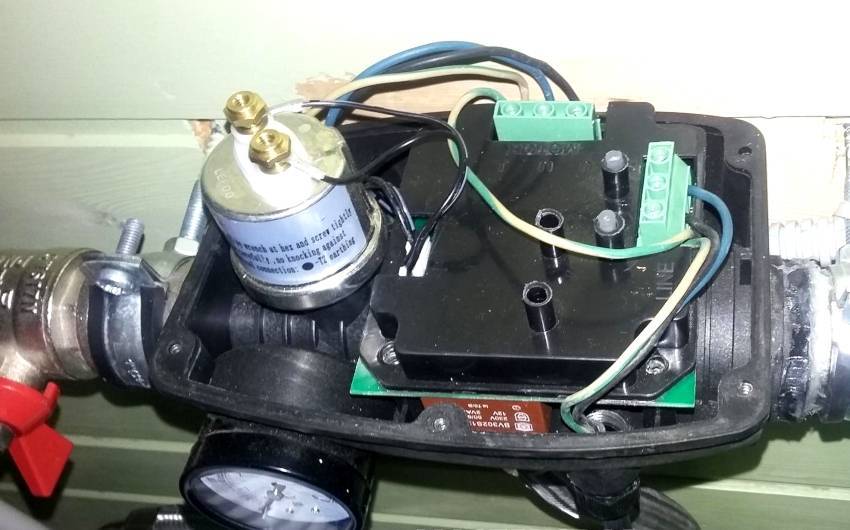 Под ней расположены контакты, обозначенные соответствующими указателями. «Насос» – место подключения указанного агрегата, «сеть» – точка для подвода кабеля электрического питания.