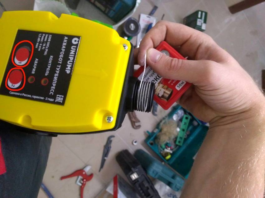 Если меток не обнаружено (такой недостаток присутствует у некоторых моделей гидроаккумулятров), хозяину придётся обращаться к электрику, так как определять на глаз способ подключения нельзя. Для герметизации места соединения реле со штуцером используется технический лён (пакля) с герметиком либо лента ФУМ.