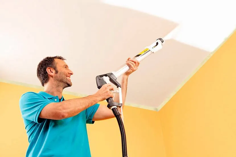 Нанесение водоэмульсионной краски на потолок с помощью пульверилизатораИсточник gidpokraske.ru