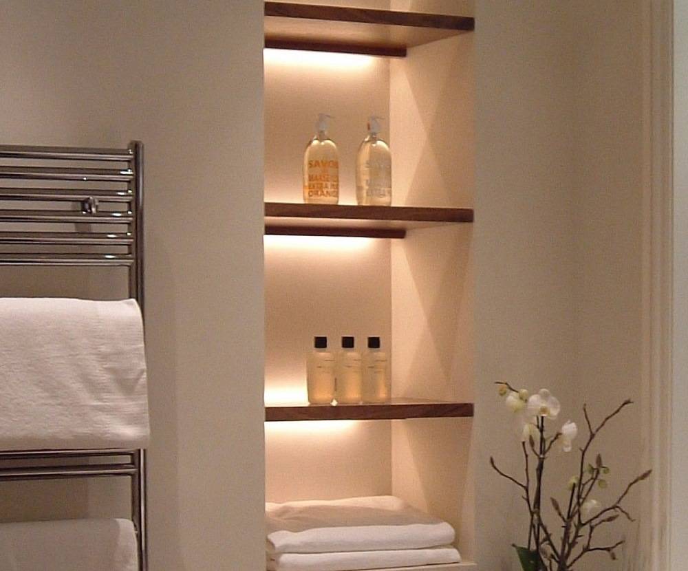 После того, как будет разработан план подвода коммуникаций, то есть техническая часть, можно уделить внимание размещению полок и мебели. Обратите внимание!Если вы желаете иметь встроенные полки с подсветкой, то электрическая разводка должна быть сделана до начала работ по облицовке плиткой