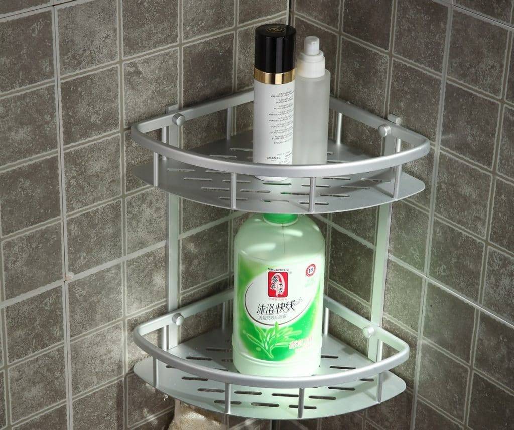 Первый тип полок (угловые трёхъярусные) позволяет избежать появления нерабочего пространства в углу ванной комнаты. Наиболее практичными и удобными среди таких полок являются модели, у которых решётка играет роль стойки. Такие конструкции также могут иметь особенности в своём строении (дополнительное место для мочалки и др).