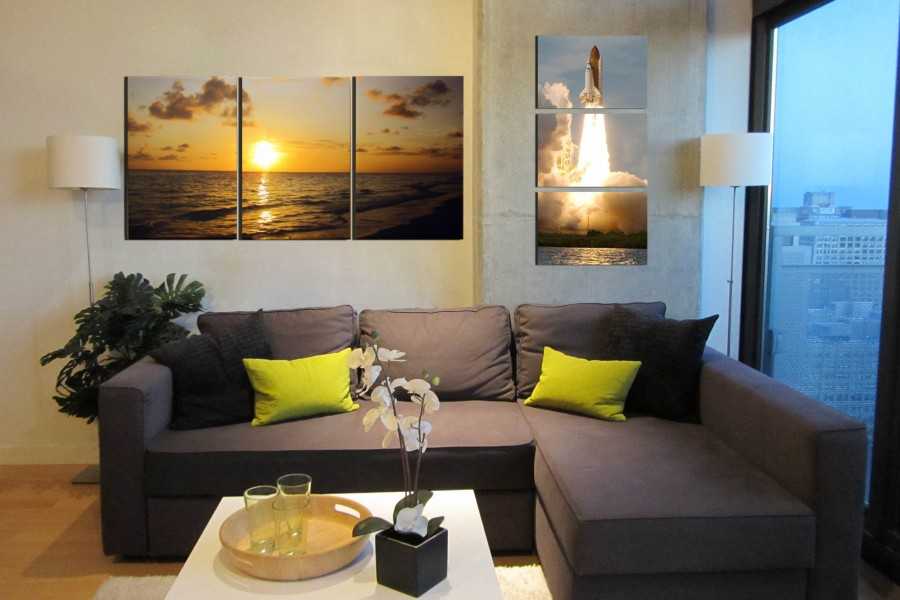 - Фотокартины выглядят дорого и роскошно, но при этом стоят значительно дешевле, чем, например, картины, написанные маслом. Подобные картины в интерьере гостиной помогут вам создать впечатляющий эффект.