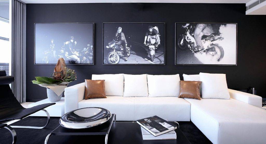 Чёрно-белые картинки размещают в гостиных или в холлах зданий