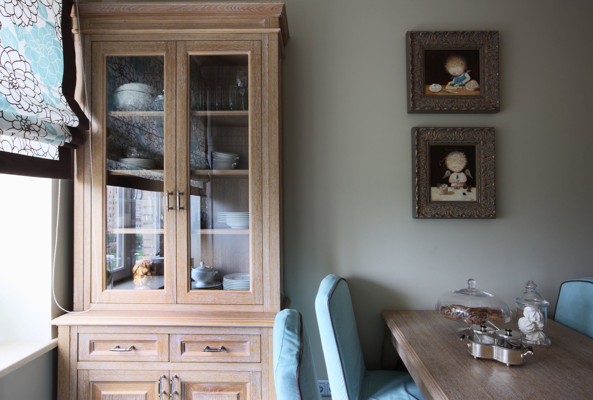 На фото выше представлена обеденная зона кухни квартиры в Царском селе. Здесь в деталях интерьера основным элементом выступают цвет и фактура состаренного дерева. Объемные рамы имеют более темный оттенок по сравнению со столом и буфетом, но легкая позолота на рельефных частях вносит светлый тон.
