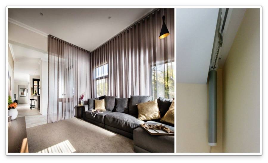 Данная система весьма схожа с багетными карнизами, только управление закрытием и открытием штор управляет если не электроэнергия, то банальная физическая сила.