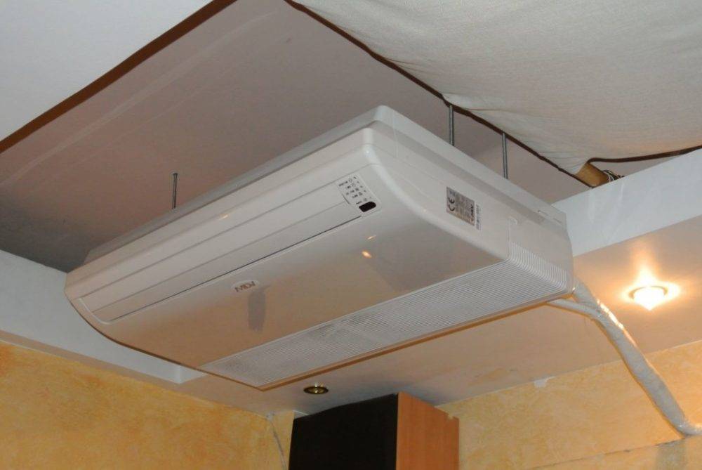 - Подпотолочный кондиционер, по виду обычная плоская коробка, установленная на потолке с помощью кронштейнов. Охлаждает воздух внутри комнаты, прогоняя поток через внутренний теплообменник без забора воздуха с улицы;