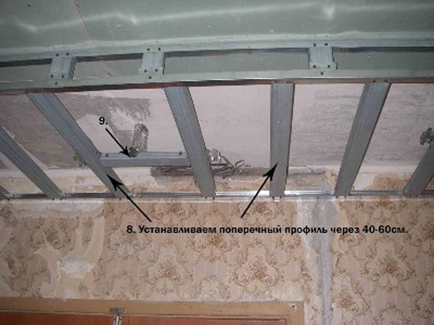 На потолке нужно отметить места будущих металлических профилей. Если потолок многоуровневый – то с шагом 60 см. Затем между ними отмечаем места для поперечных профилей – с шагом 40 см. Впоследствии на этих местах будут установлены П-образные кронштейны. Именно на них будет приходиться основная нагрузка потолка.
