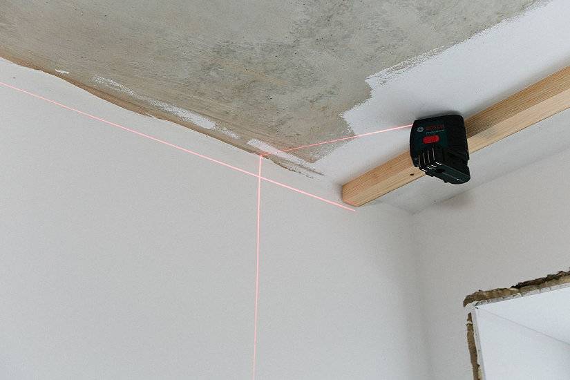 После произведенных расчетов при помощи лазерного уровня на стены в помещении наносится линия. По ней будет устанавливаться профиль. Это отметка должна быть идеально ровной.