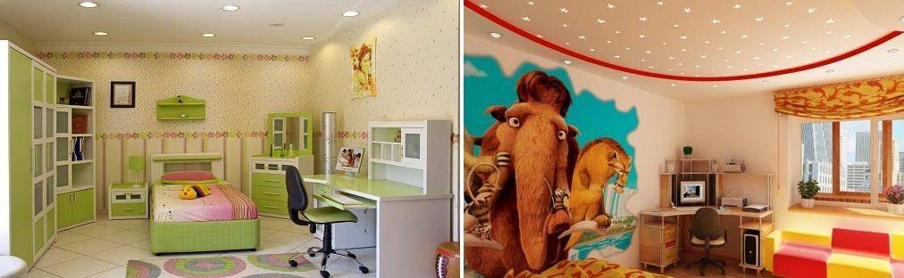 Самый оптимальный вариант – это потолки из гипсокартона в детской комнате. Этот материал устойчив к влаге, имеет высокие показатели пожароустойчивости, легко монтируется своими руками, а в случае повреждения его незначительной части можно обойтись заменой небольшого участка, не меняя все полотно потолка.