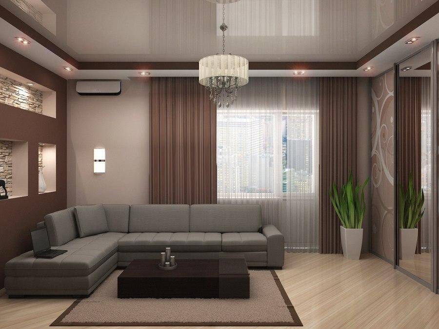 Два уровня подойдут и для гостиных с не очень высоким потолком. В этом случае обрамление вдоль стен лучше делать не очень широким и не сильно опускать его. Что касается цветов, больше подойдут светлые тона или глянцевые материалы, хорошо отражающие свет.