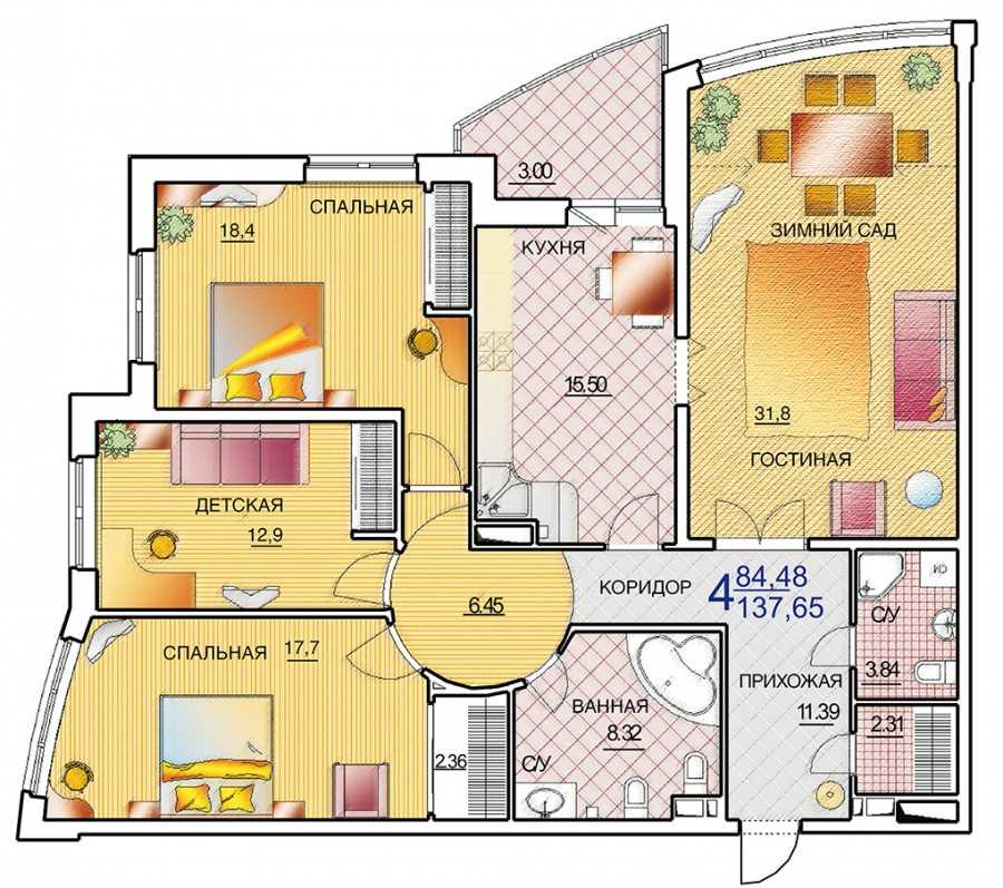 Варианты перепланировки и зонирования в трехкомнатной квартире