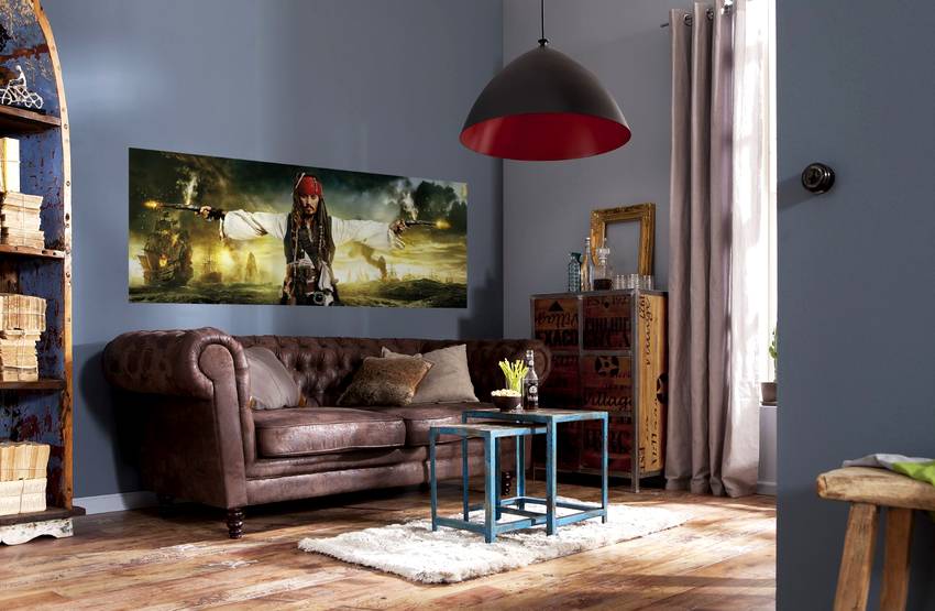 В минималистичной гостиной интересно будет смотреться фото с видом на море или океан, а в детской корабли с пиратами и подводный мир.