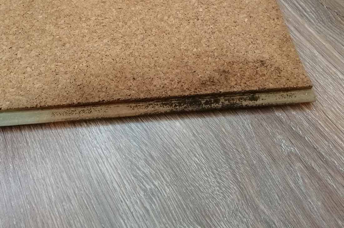 Где-то прочитал информацию, что пробковая подложка, если ее стелить на бетон без пленки сгниет, превращается в труху и так далее. Ничего подобного. В одном месте под радиатором отопления, где заботливая теща вешала сушить белье, проникла вода. В том месте между плитами возник зазор. Лист ХДФ плиты почернел, но пробка только изменила цвет. То есть она не покрывается плесенью за счет природных веществ, в ней содержащихся.