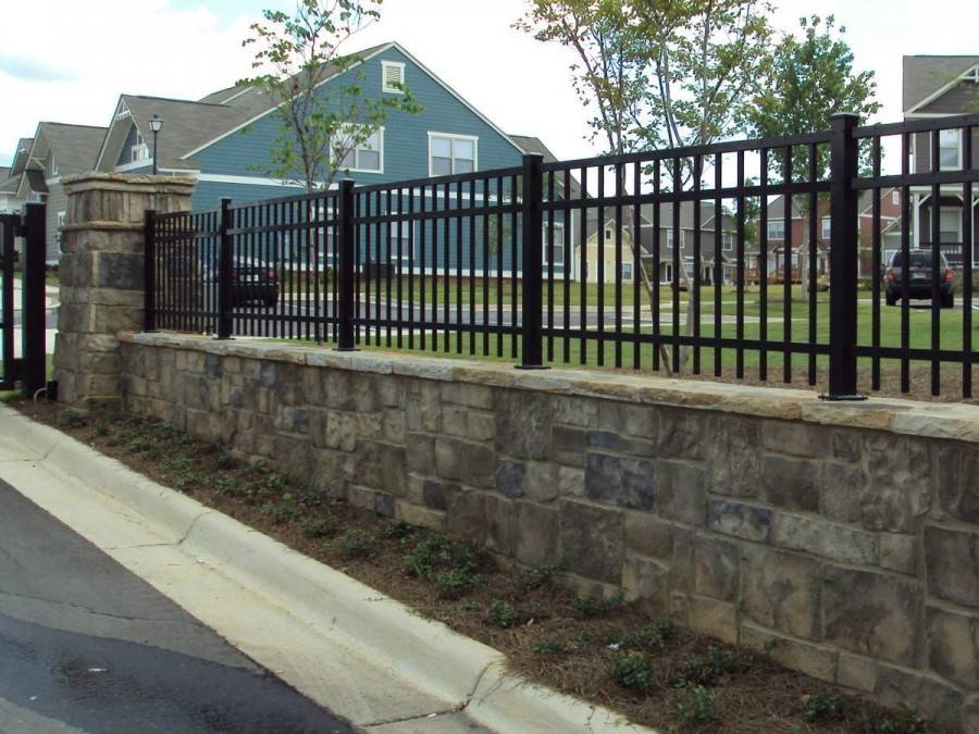 Следующая группа ограждений – это заборы, изготовленные из натурального и искусственного камня. Сюда также входят строения из кирпича и даже бетона. Все они отличаются повышенной надёжностью и громадным сроком службы, а также излишней дороговизной и некоторой монументальностью. Дизайнерам порой приходится изрядно попотеть, чтобы из таких тяжёлых материалов сотворить изящную и красивую ограду.