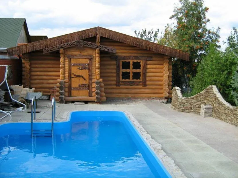 Если планировка бани 6 на 6 не предполагает места для бассейна, то перед входом в здание можно установить бочку с прохладной водой или оборудовать небольшой пруд, куда так приятно окунуться после жаркой парной. При наличии отдельного выхода к естественному водоему, следует располагать выход из бани «лицом» к нему, чтобы максимально приблизить погружение в воду и скрыть людей от чужих глаз.