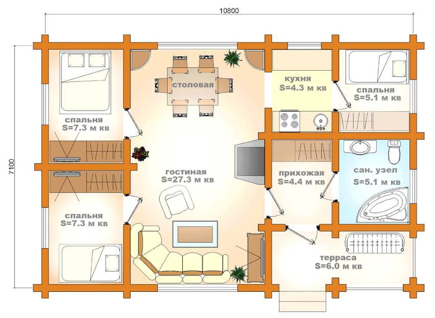 В некоторых случаях также строят финские газобетонные дома. Один из таких проектов начинается с прихожей 1,9 м2. На единственном этаже оборудуют пару спален. Площадь террасы достигает примерно 21 м2. Конструкция предусматривает наличие 2 спален.