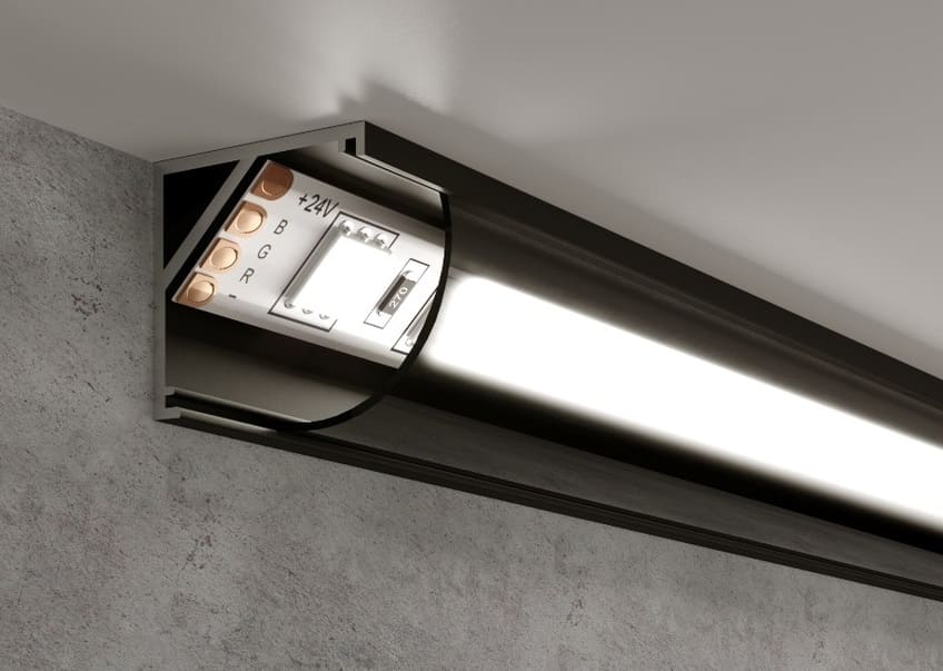 Угловые короба представляют собой основание треугольного сечения, с прорезью по центру. Монтаж углового профиля для светодиодной ленты проводится в стыках, где потолок примыкает к стене или стена к полу. Также можно проводить монтаж на стыках двух стен. Особенностью элемента является съемный рассеиватель света.