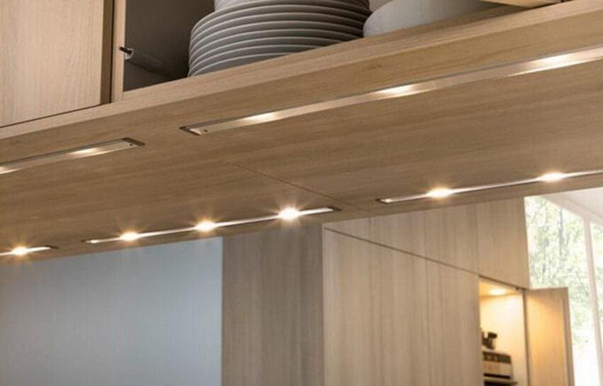 - Встраиваемый или врезной вариант. Это отличное дизайнерское решение. Такие виды позволяют объединить ДСП с гипсокартонном, а светодиодная лента устанавливается на месте соединения. Отличительной особенностью такого варианта является наличие края, который в местах паза закрывает неровность. Благодаря ему можно осветить рабочую кухонную поверхность и при этом светодиоды не будут выпирать у шкафчиков. В ДСП прорезается углубление необходимой глубины, и в него вставляется лента. Таким образом, создается впечатление, что кухонный шкаф светится сам.