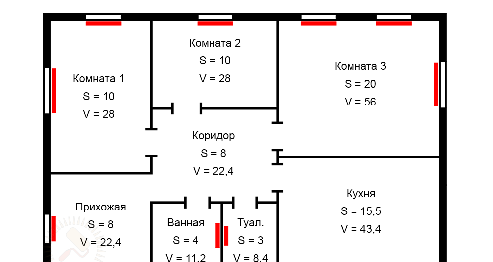 - комната 3: 20 м2 · 2,8 м = 56 м3
