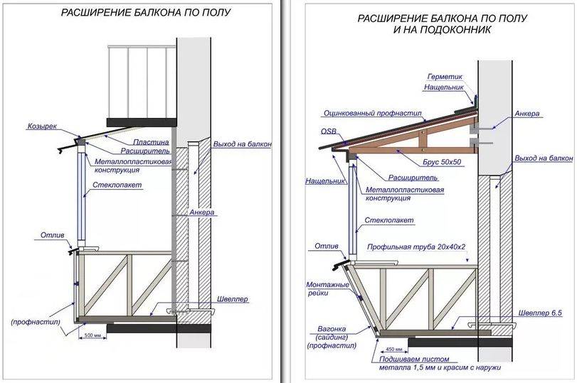 Технологию выбирают в зависимости от того, как планируется использовать полученную площадь в дальнейшем. Одно дело — немного расширить для того, чтобы вынести остекление, другое — чтобы можно было поставить более массивную мебель и организовать продолжение комнаты или зону отдыха.