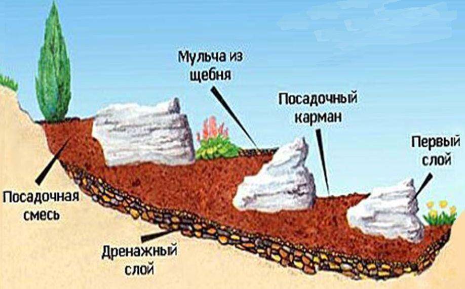 Перед формированием альпийской горки нужно проработать схему с предварительным планом размещения объектов. Нужно учитывать, что один кустик растет при любой освещенности, а другой требует тень или постоянный свет. Все параметры отмечаются на схеме, а уже потом она проверяется. Затем можно приступать к работе. Схема посадки по ярусам горки: