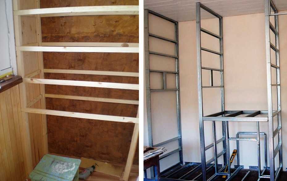 Стойки для шкафа чаще всего делают из бруса. Сечение примерно 40*40 мм или 50*50 мм. Вариант неплохой, но на неотапливаемом балконе может быть высокая влажность. А дерево — такой материал, который изменяет размеры в зависимости от влажности. Есть еще один момент: не во всех регионах брус дешев.