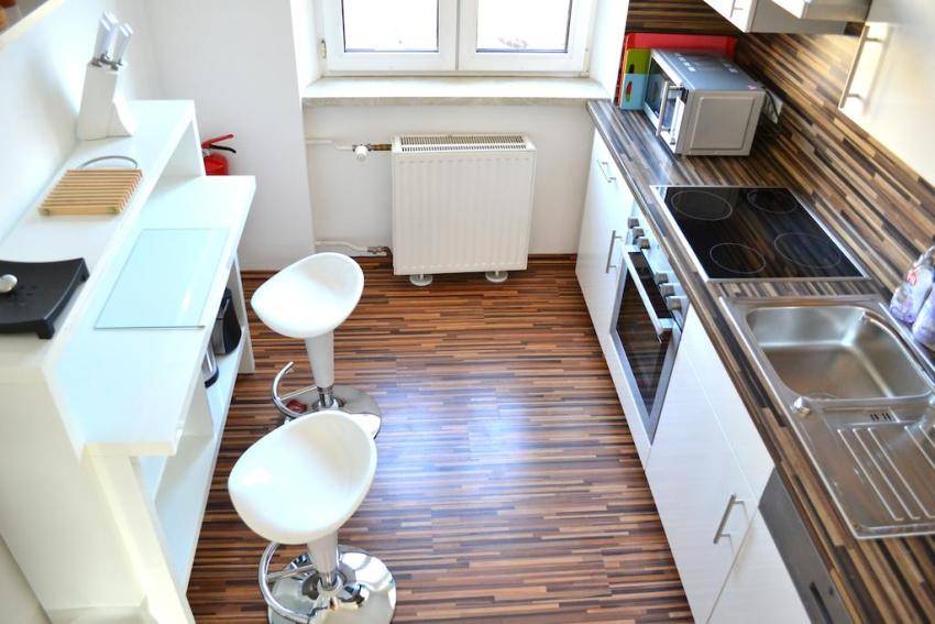 Только правильно выбирай класс и марку ламината. Кухня – это постоянные загрязнения, высокие температуры, жирные пятна, риск падения тяжелой утвари. Покрытие должно быть износостойким.