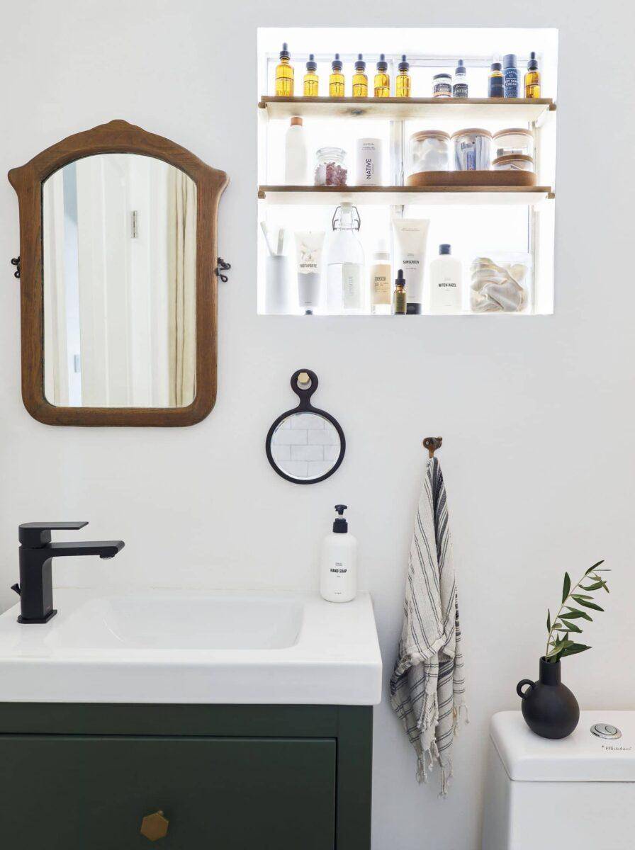 Для средств гигиены вместо громоздких напольных шкафов можно повесить компактные подвесные шкафчики.