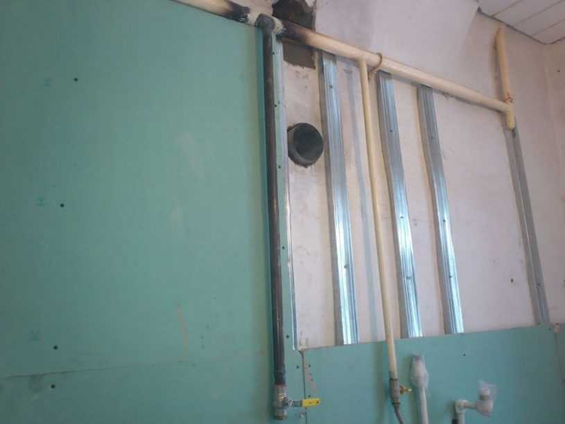 Строители рекомендуют подготовить каркас из металлического профиля и закрепить сверху листы влагостойкого гипсокартона, что выглядит на фото очень эстетично. Если ванная комната и туалет слишком маленькие, стоит закрепить гипсокартон при помощи клея, не устанавливая каркаса.