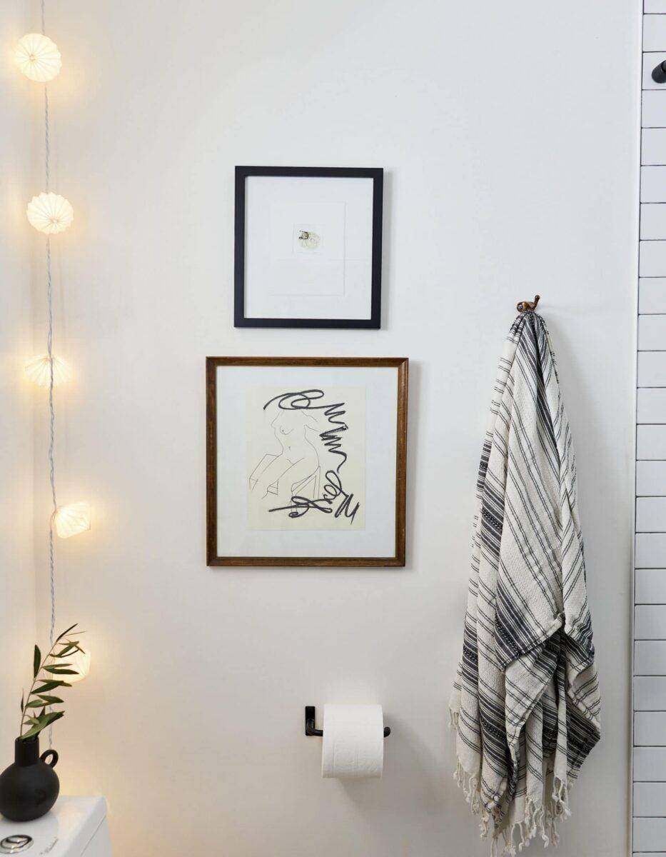 Выбирая активный рисунок для стен, откажитесь от навесных шкафов в туалете.