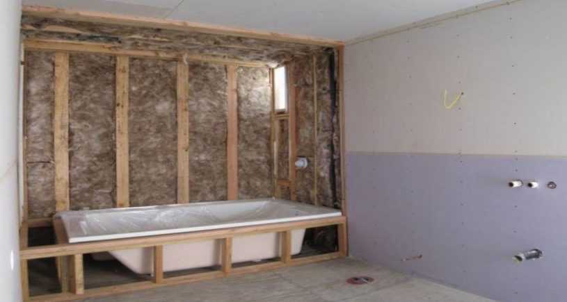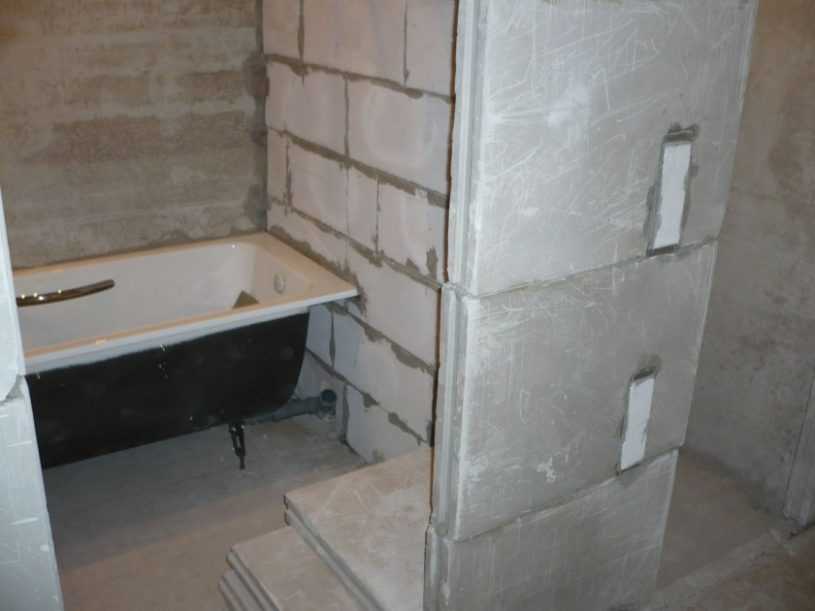 После возведения новых стен, их требуется выровнять при помощи гипсовой или цементной штукатурки, которая хорошо переносит влагу и отлично подходит для использования в ванной.