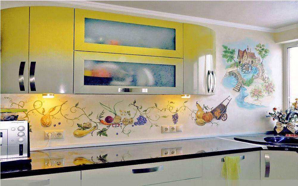 Наши кухни редко бывают большими, поэтому нашей задачей здесь будет увеличить пространство. Пусть это будет художественная роспись, которая уведет зрителя вдаль или изображения достопримечательностей какого-либо города.