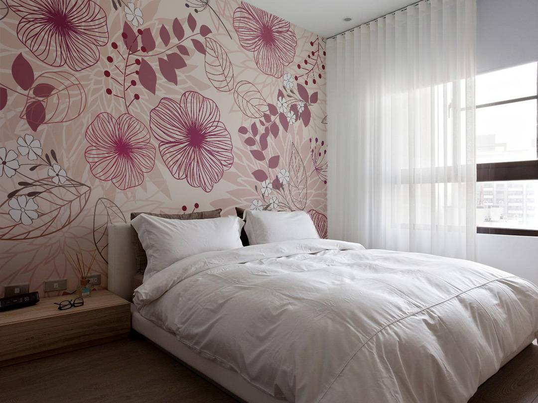 - Фотообои с изображением цветочного или растительного орнамента в розовом цвете прекрасно будут смотреться в изголовье кровати.
