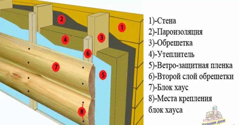 Обшивка дома деревянным блок-хаусом по деревянной обрешетке, с ветрозащитной и влаго-защитной мембраной