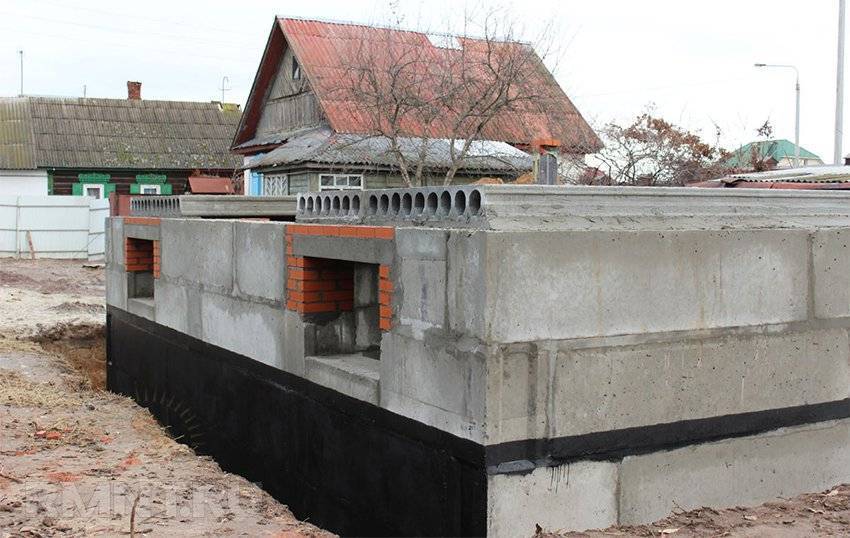 - на готовый фундамент укладывают гидроизоляцию, которая предотвратит распространение влаги от грунта на стены;