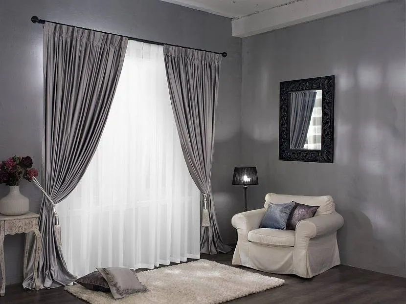 - Для дополнения серого интерьера используют текстиль. Красиво выглядят серые шторы.