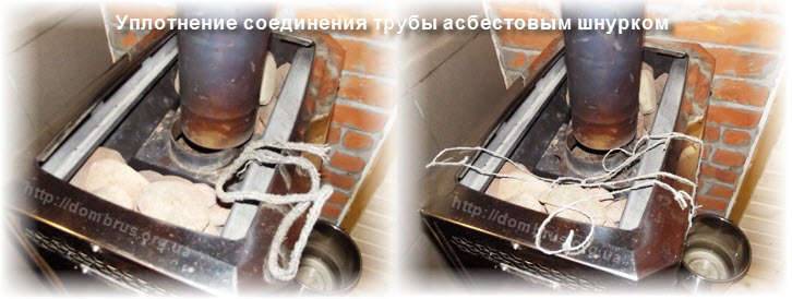 Для начала я решил уплотнить трубу. Она, просто, стояла на патрубке печки под своим весом без герметика и без уплотнителя. Я приподнял ее и поставил на ребро патрубка для удобства намотки асбестового шнура. Это одна из основных особенностей монтажа трубы из нержавеющей стали – скользящее соединение с конструкцией потолка и крыши. Конструкции не должны крепиться неподвижным соединением.