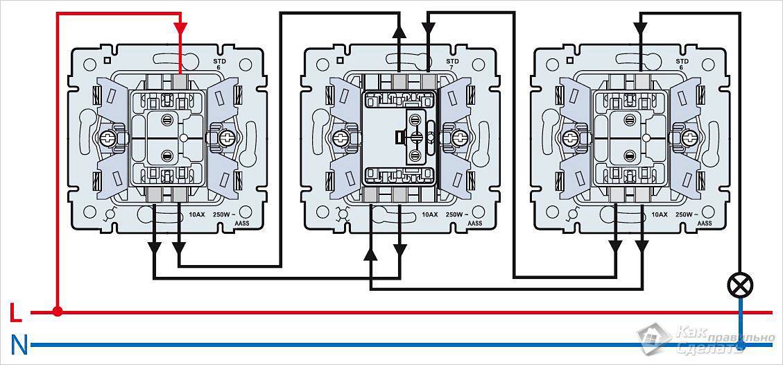 Принцип подключения проходных выключателей