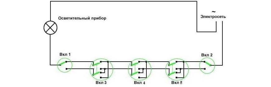Если нужно управлять включением и выключением лампочки из четырех, пяти и более мест, схема, описанная для трех точек, меняется незначительно – добавляется больше перекрестных переключателей. Когда точек для управления светом n штук, тогда приобретать такие переключатели нужно в количестве (n-2) штук. И они всегда будут расположены посередине в схеме, где с одного конца находится источник тока, а с другого источник света (лампа).