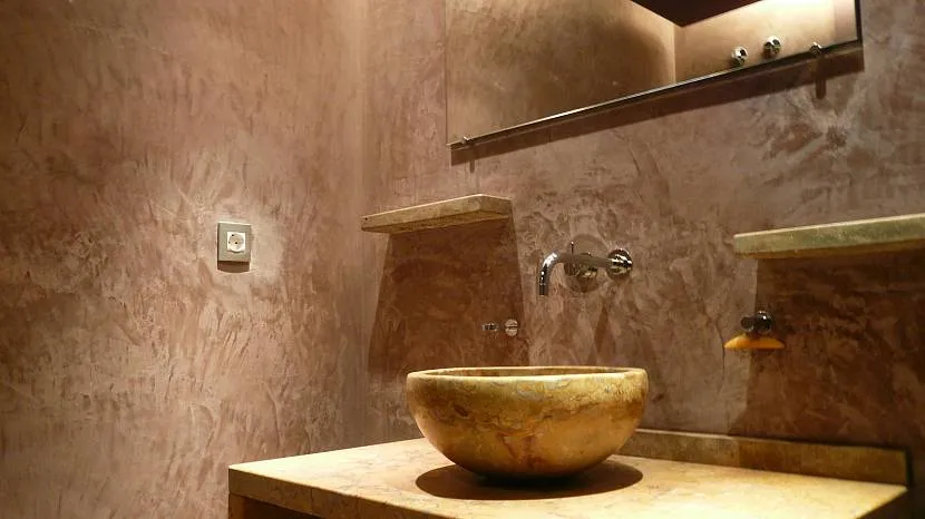 В числе первых – «венецианка». Ее нанесение позволяет получать идеально ровную поверхность, имеющую глянцевый или перламутровый перелив. В составе присутствует восковой компонент, который отталкивает влагу и не позволяет воде впитываться в структуру отделки. Такая декоративная штукатурка в санузле и в ванной комнате смотрится великолепно. Она идеально подходит для создания классических интерьеров, для украшения комнат, в которых присутствуют арочные своды, колонны, пилястры. Опытный мастер способен создавать при помощи такой штукатурки красивые фрески. Его работа, да и сам состав, стоит дорого, но результат того стоит. Выбор такого состава оправдан, если нужно поддержать высокий статус хозяев жилья.