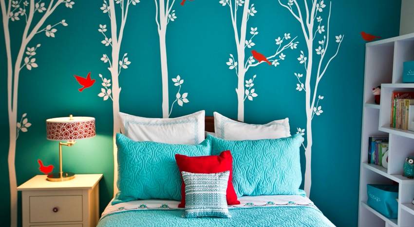Прекрасно сделать такой спальню. Лазурный, бирюзовый, цвет морской волны способствуют расслаблению, помогают спокойно уснуть. Можно использовать этот фон, украшенный зеленой листвой, это создаст атмосферу природы.