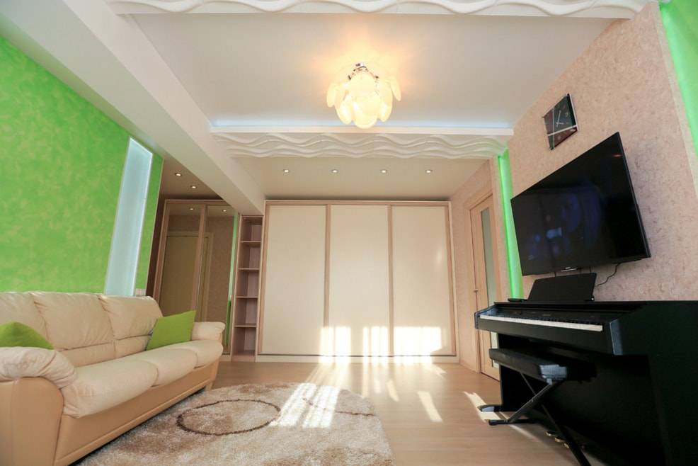 В этой квартире очень уютный и стильный ремонт. Во многом, такое впечатление складывается из-за удачно смонтированных шкафов-купе, экономящих пространство. Опять же как здорово подобрано освещение в прихожей: мебель приобретает некоторый лоск и завораживающий стиль, приближаясь к идеалу.